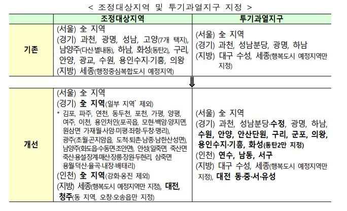 조정대상지역 지정 후에도 과열이 지속되고 있거나, 비규제지역 중 과열이 심각한 지역 중 경기 10개 지역, 인천 3개 지역, 대전 4개 지역을 투기 과열지구로 지정했습니다.