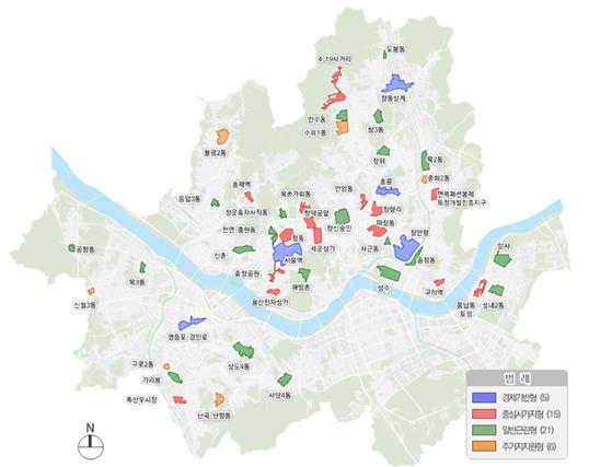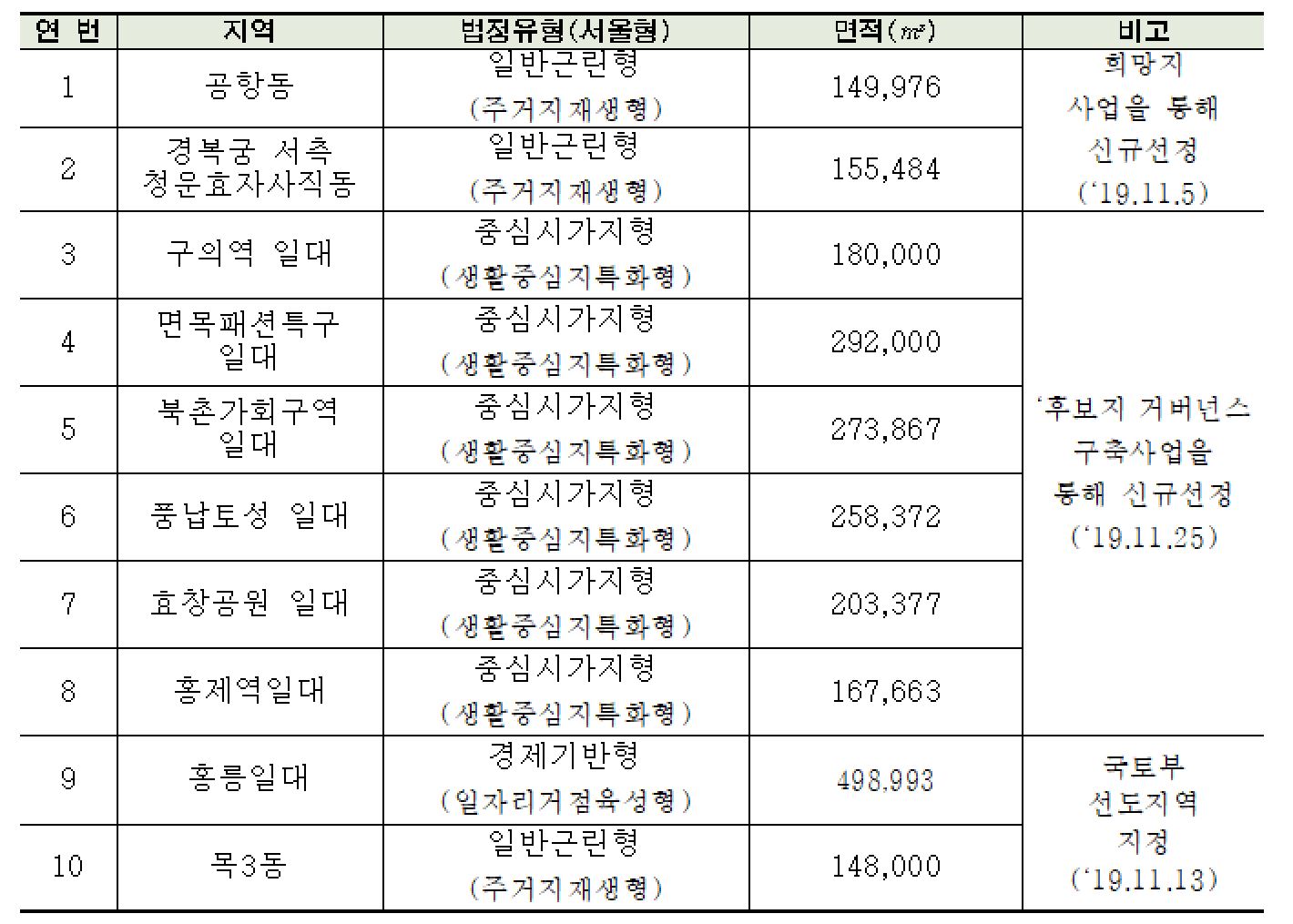 북촌가회구역, 홍제역, 효창공원, 구의역, 풍납토성, 면목패션특구 일대입니다. 이 지역들은 다소 쇠퇴한 산업, 상업, 역사문화 특화지역 중 지난해 11월 중심시가지형 도시재생활성화지역으로 신규 선정된 지역입니다.