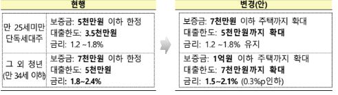 - 청년 전용 버팀목 전세 금리인하 및 지원확대 : 총 4천 가구 이상에 약 6.6만원/년 이자 경감, 입주가능 주택범위 및 대출한도 확대