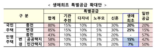 현재 국민주택의 20%를 생애 최초로 주택을 마련하는 경우에 한해 특별공급을 통한 추첨을 하고 있는데 이 점이 개선됩니다. 무주택 실수요자의 내 집 마련을 지원하기 위해 생애 최초 특별공급의 적용 대상 주택 범위와 공급 비율을 확대합니다. 적용대상은 국민주택뿐만 아니라 민영주택에도 도입됩니다. 소득기준은 국민주택은 도시근로자 월평균소득 100% 유지하되, 민영주택은 도시근로자 월평균 소득 130% 이하까지 확대됩니다.