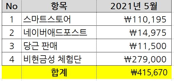 현재 내가 운영하고 있는 네이버 블로그의 일방문자수는 250~300 정도 나온다. 평균적으로 300을 넘는 것은 아니다. 300 넘은적이 딱 하루 있었다. 5월 들어 주 5회 이상 블로그를 작성하였고 나의 공간을 꾸민다는 생각으로 나름 많은 글자 수와 정성스러운 사진, 이웃과의 소통을 꾸준하게 하고 있다. 그리고 5월에는 31일이라는 긴 날자수만큼이나 소소하지만 역대 최고 금액을 달성하였다.