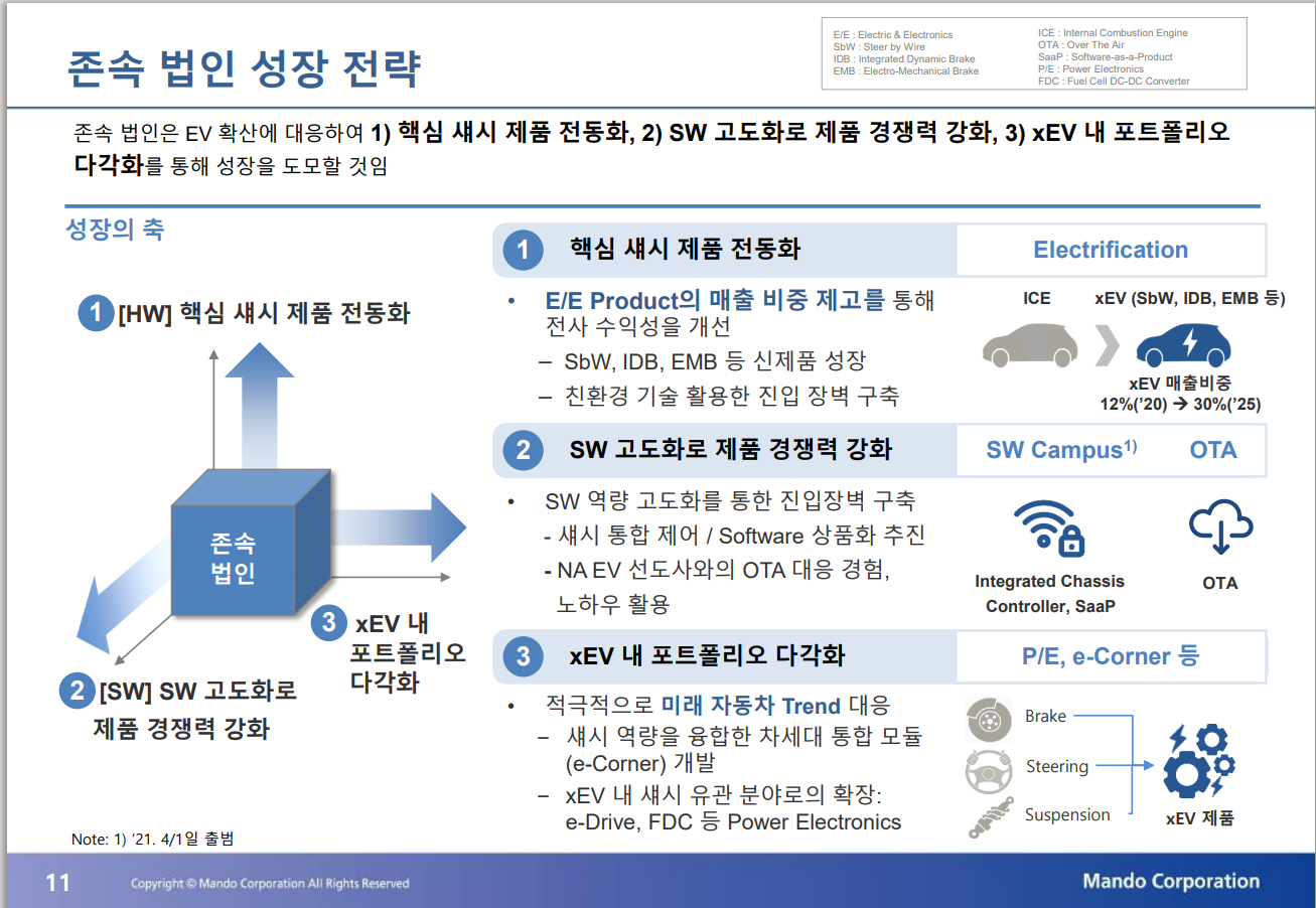 만도는 사업구조 재편을 통한 사업영역별 전문성 강화 및 경영 효율성 제고를 위하여 물적 분할 및 사업 구조 개편을 한다고 공시하였다. 요약 하면 현재 만도의 사업 부문 중 자율주행+모빌리티 부문을 별도로 분할하여 별도의 법인을 설립하여 사업 역량을 집중하겠다는 것이다. (이하 만도 공시 내용 발췌)