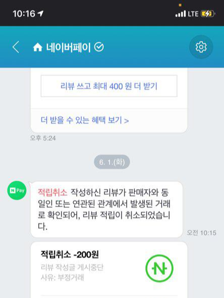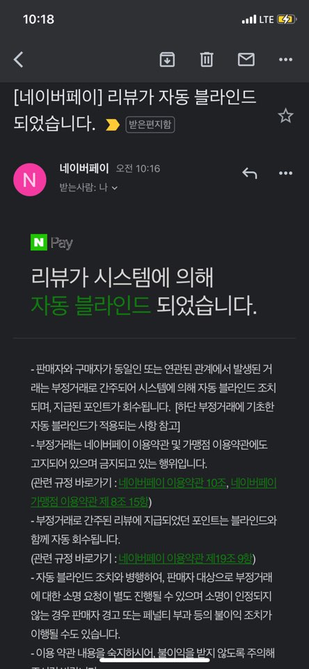 남편에게 갑자기 몇장의 이미지가 전송되었다. 작성하신 리뷰가 판매자와 동일인 또는 연관된 관계에서 발생된 거래로 확인되어, 리뷰 적립이 취소되었습니다. 그러면서 자동 블라인드 처리가 되었다는 안내도 함께 받았다고 한다. 내가 네이버를 너무 우습게 봤다.