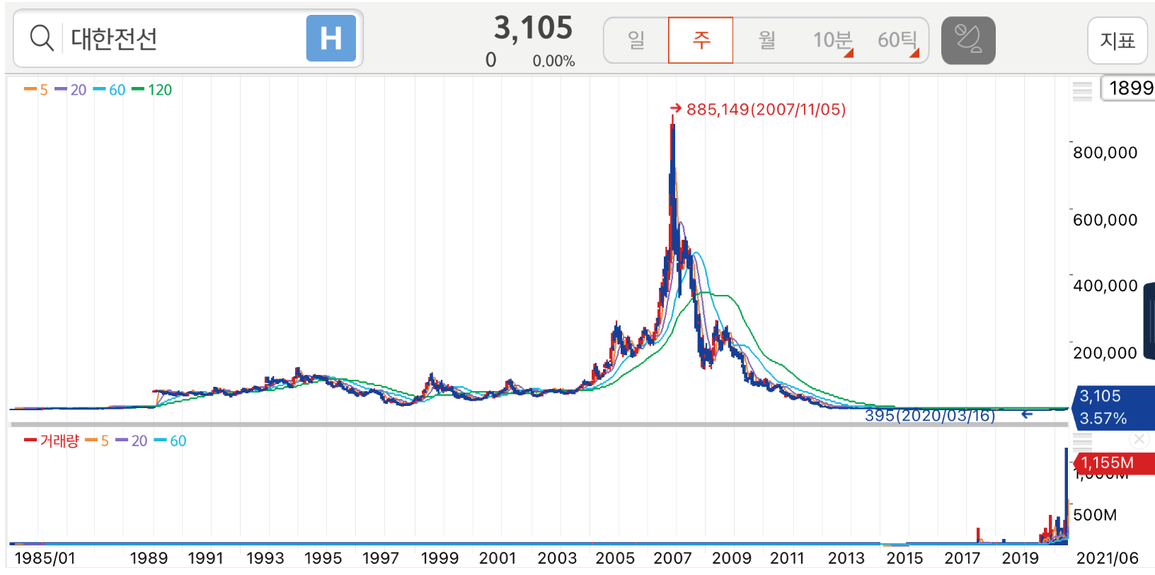 처음 대한전선의 주식을 단기간으로 한정해서 보고 정말 많이 올랐다는 생각을 했었다. 그러다가 생각보다 오래된 회사라는 것을 알고 나서 문득 예전의 주가가 궁금해서 확인을 해보니 한때 최고가가 885,149원인적이 있었다. 그 가격을 보다가 지금의 가격을 보니 다소 처참해 보이기도 하다. 설마 최고가에 주식을 사셨다가 아직까지 물려있으신 분들은 안 계시겠지. 날짜를 보니 대략 14년 전인데, 만약 그런 분이 계시다면 최근 며칠의 주가 상승은 간에 기별도 가지 않겠다 라는 생각을 했다. 최근 호재인 소식들이 많이 들리면서 상승 모멘텀을 만난 대한 전산. 과거의 영광스러운 순간을 기억하며, 지속적으로 파이팅했으면 좋겠다.