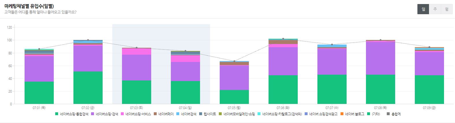 6월의 마지막 날 기분 좋게 유입수 100을 달성했다! 우선 일차 목표는 완성했고 그 이후는 조금 들쭉 날쭉한 모습이다. 7월에는 102 한 번, 100 두 번을 달성하고 나머지는 60~90대로 아주 다양하다. 7월에도 상품을 등록했음에도 다소 정체된 느낌이긴 하다. 그렇지만 이런 것에 일희일비할 필요 없고 상품 등록에 집중하자.