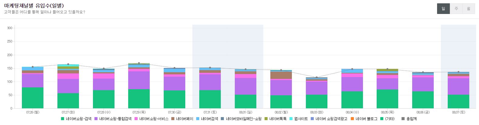 특별한 등락없이 일주일에 10 정도씩 유입이 늘어 저번 주는 150~160 정도 나왔는데 이번 주는 110~140 정도로 하락을 했다. 나도 다른 분들이 한 번씩 겪었던 유입수 하락의 시즌인 건가. 올림픽 시청과 여름휴가 기간이었기 때문이라고 스스로 합리화하며 위로해 보고자 한다.
