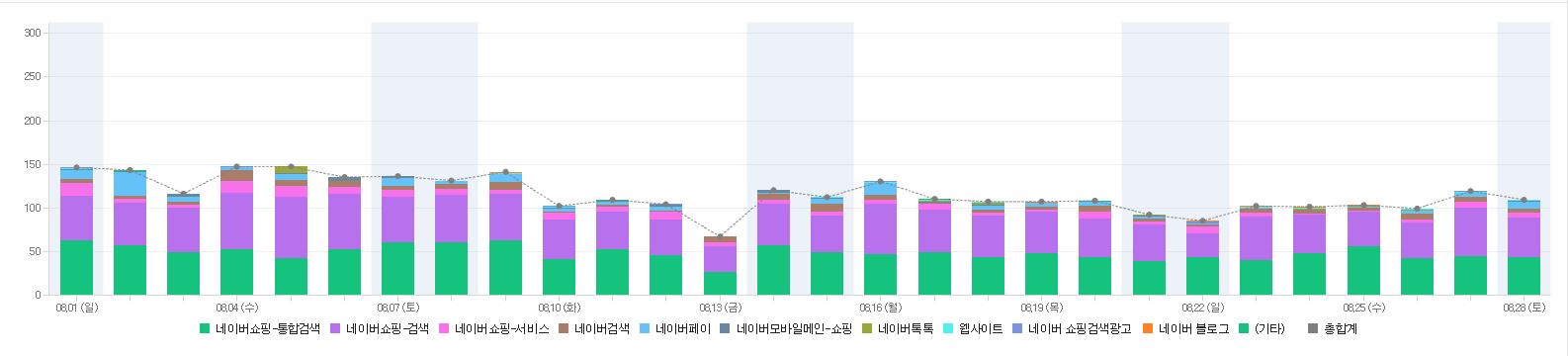8월 초 150을 넘었던 유입수는 100까지 하락한 후 도무지 올라올 생각을 안 한다. 여름 시즌이 끝이라 그런 것도 있고 여러모로 상품들이 상위 노출이 안돼서 유입이 안 되는 것 같다. 지난주만 해도 60~80까지 하락한 적도 있어지만 이번 주는 그래도 안정적인 100을 유지했다.