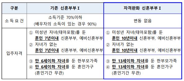 이번에 발표한 신혼부부 전세임대주택은 혼인기간과 입주대상자의 자녀 나이 등 입주자격이 기존에 비해 완화됩니다. 혼인기간과 무관하게 만 13세 이하의 자녀가 있거나, 자녀가 없더라도 혼인기간이 10년 이내인 신혼부부 및 예비 신혼부부라면 지원 가능합니다.