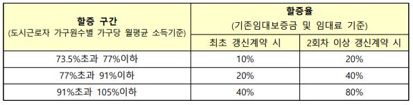 * 단, 재계약 시 입주자는 무주택세대 구성원으로서 해당 세대의 월평균 소득이 전년도 도시근로자 가구원수별 가구당 월평균 소득의 105% 이하이어야 하고, 국민임대주택 자산기준을 충족시켜야 합니다. 만약 적용되는 자산기준 및 소득 등을 충족시키지 못할 경우 임대보증금 및 임대료가 할증됩니다.